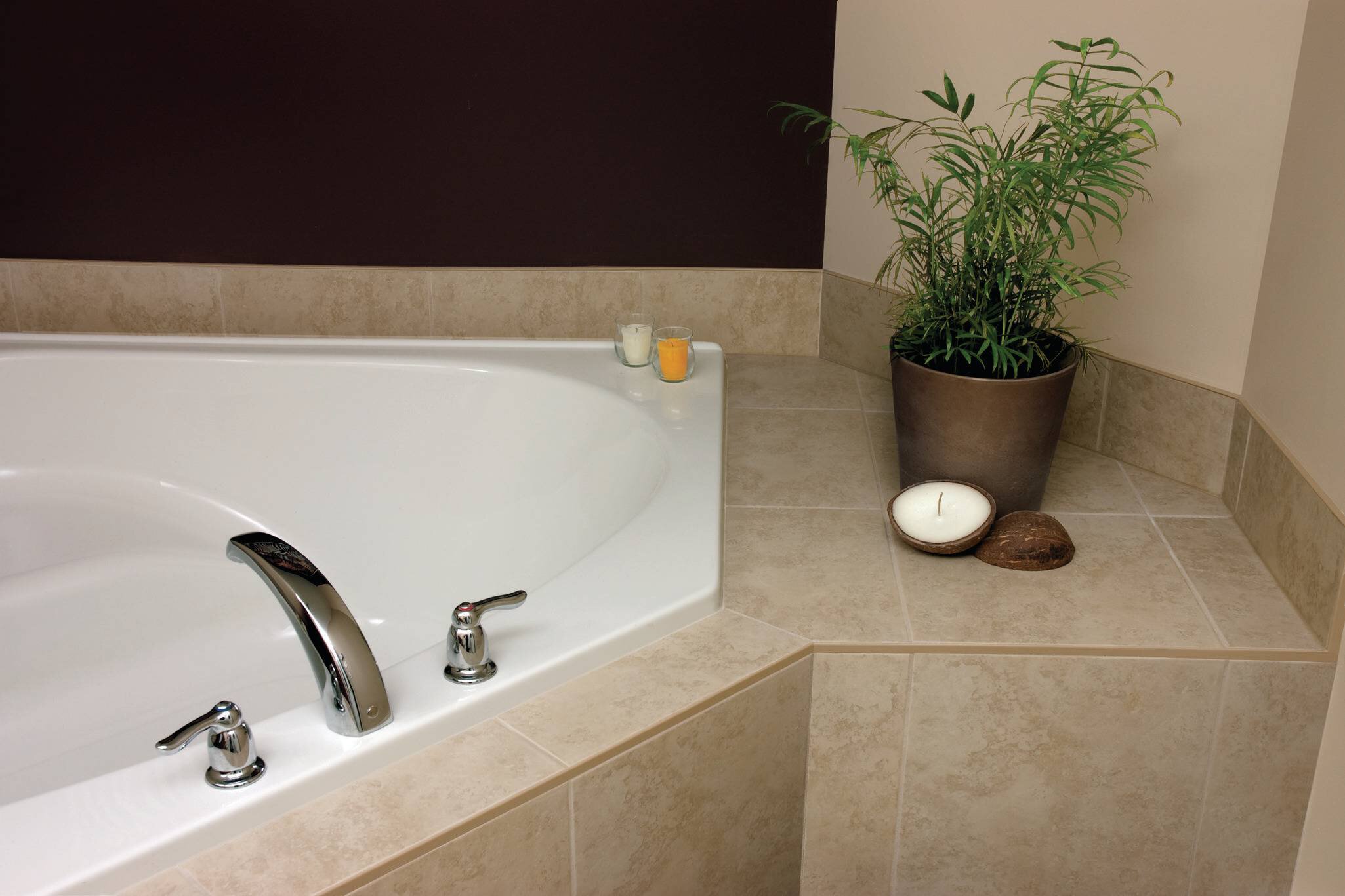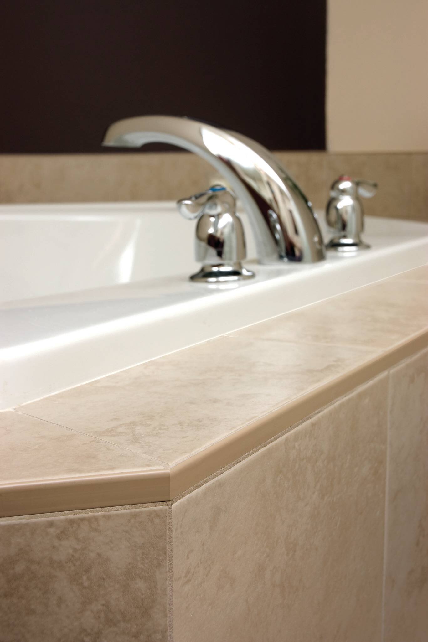 Perfil de borde recto JOLLY aplicado a los bordes de las baldosas de la plataforma de la bañera y la base de baldosas.