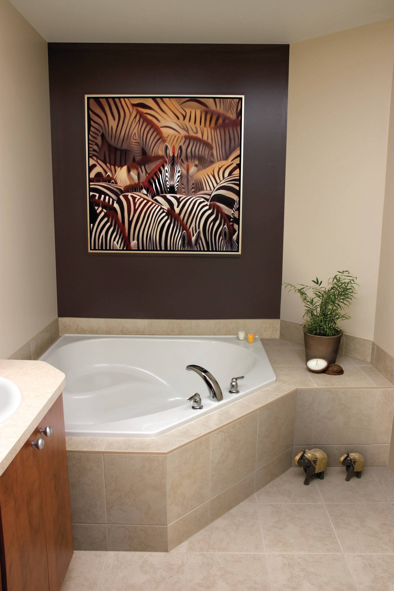 Los perfiles beige claro crean un acabado sutil al combinarse con las baldosas neutras de este baño contemporáneo. Perfil de borde recto JOLLY aplicado a los bordes de las baldosas de la plataforma de la bañera y la base de baldosas. KERDI-BOARD se utiliza para crear esta plataforma de bañera personalizada. DITRA es ideal para proporcionar desacoplamiento e impermeabilización bajo el piso de baldosas.