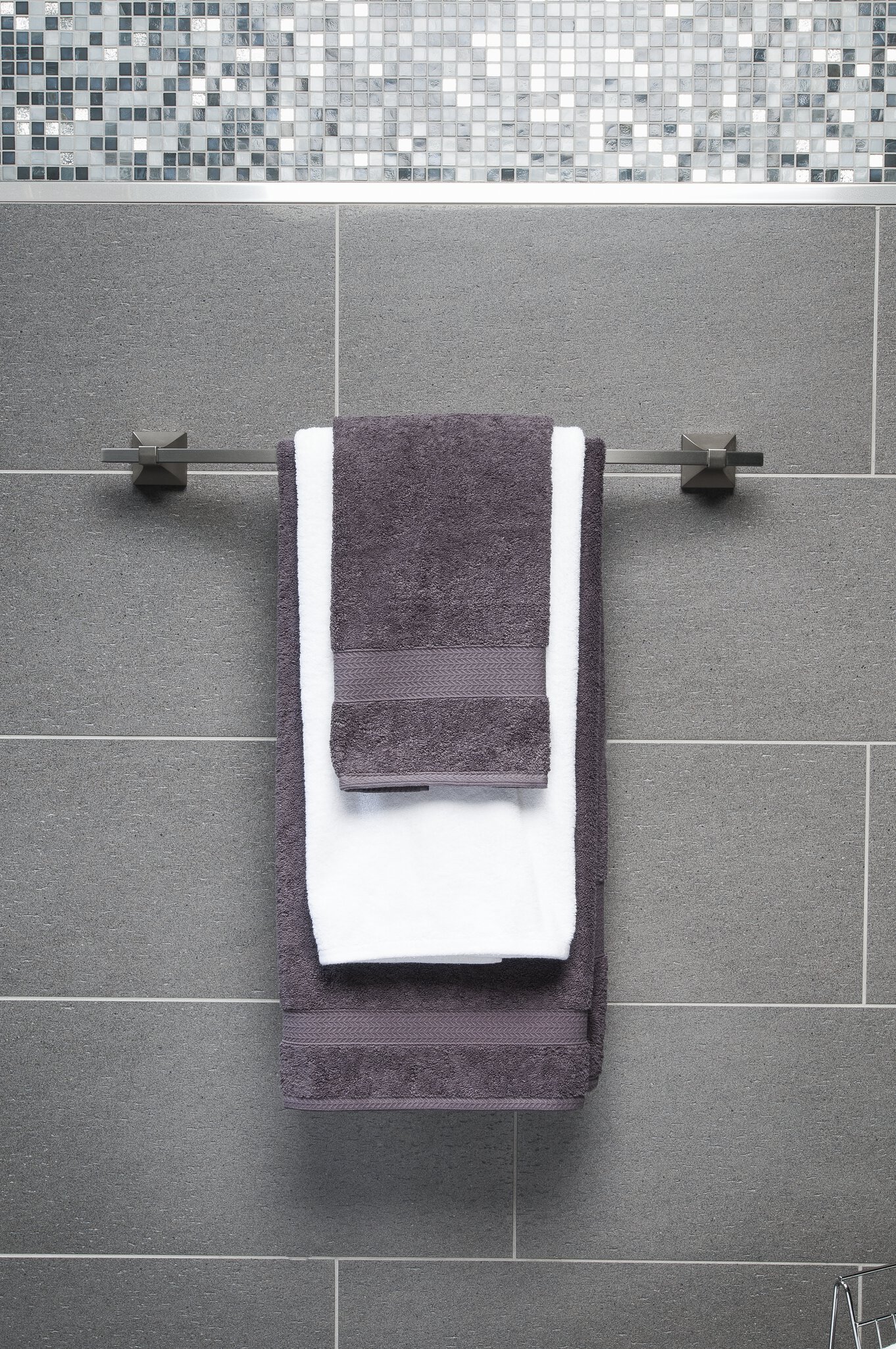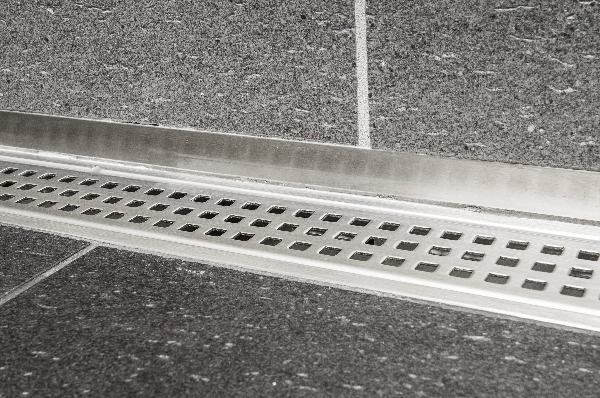 El drenaje lineal KERDI-LINE se presenta aquí con la rejilla SQUARE de acero inoxidable, creando un aspecto moderno en esta sala de baño.