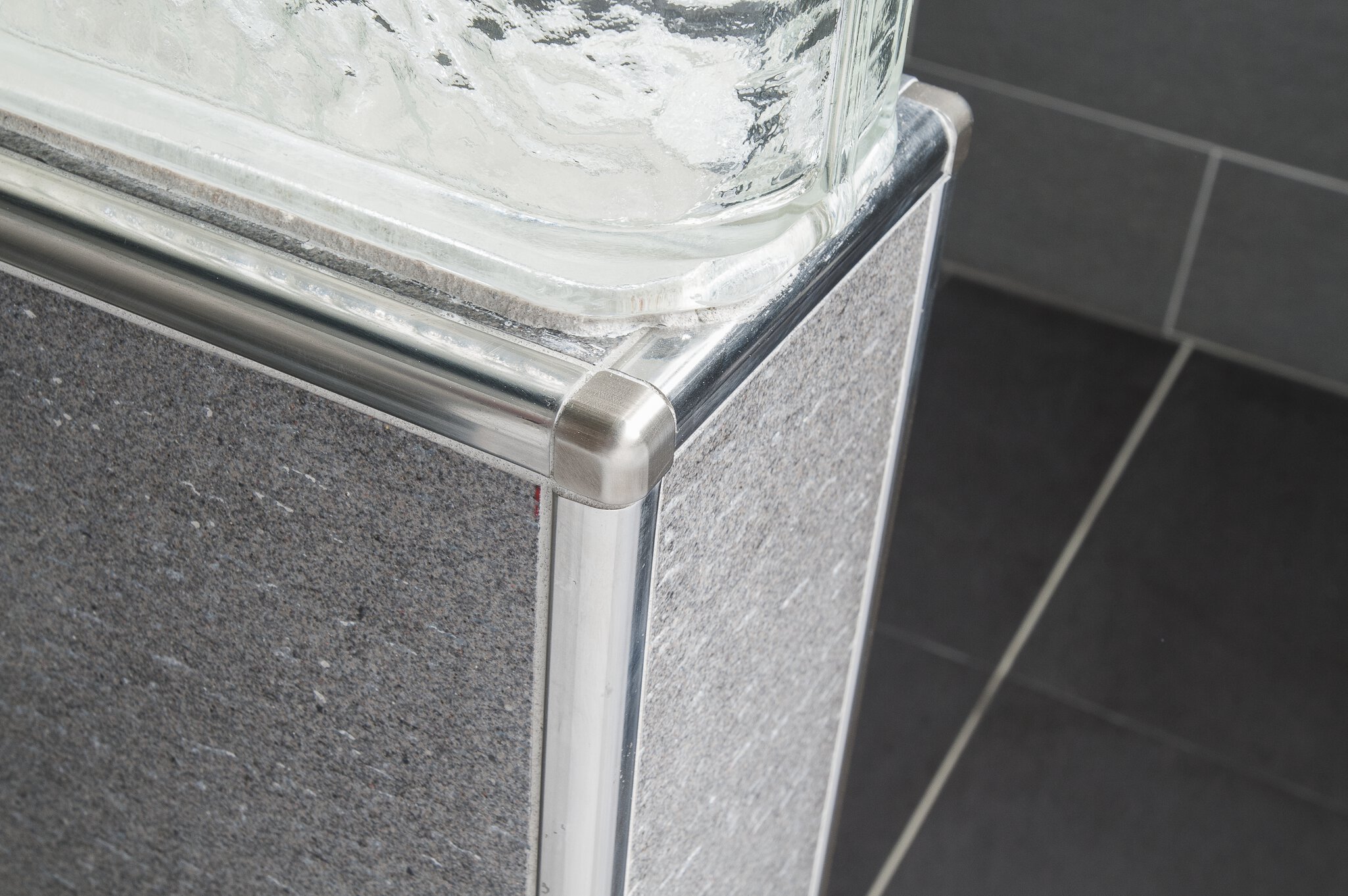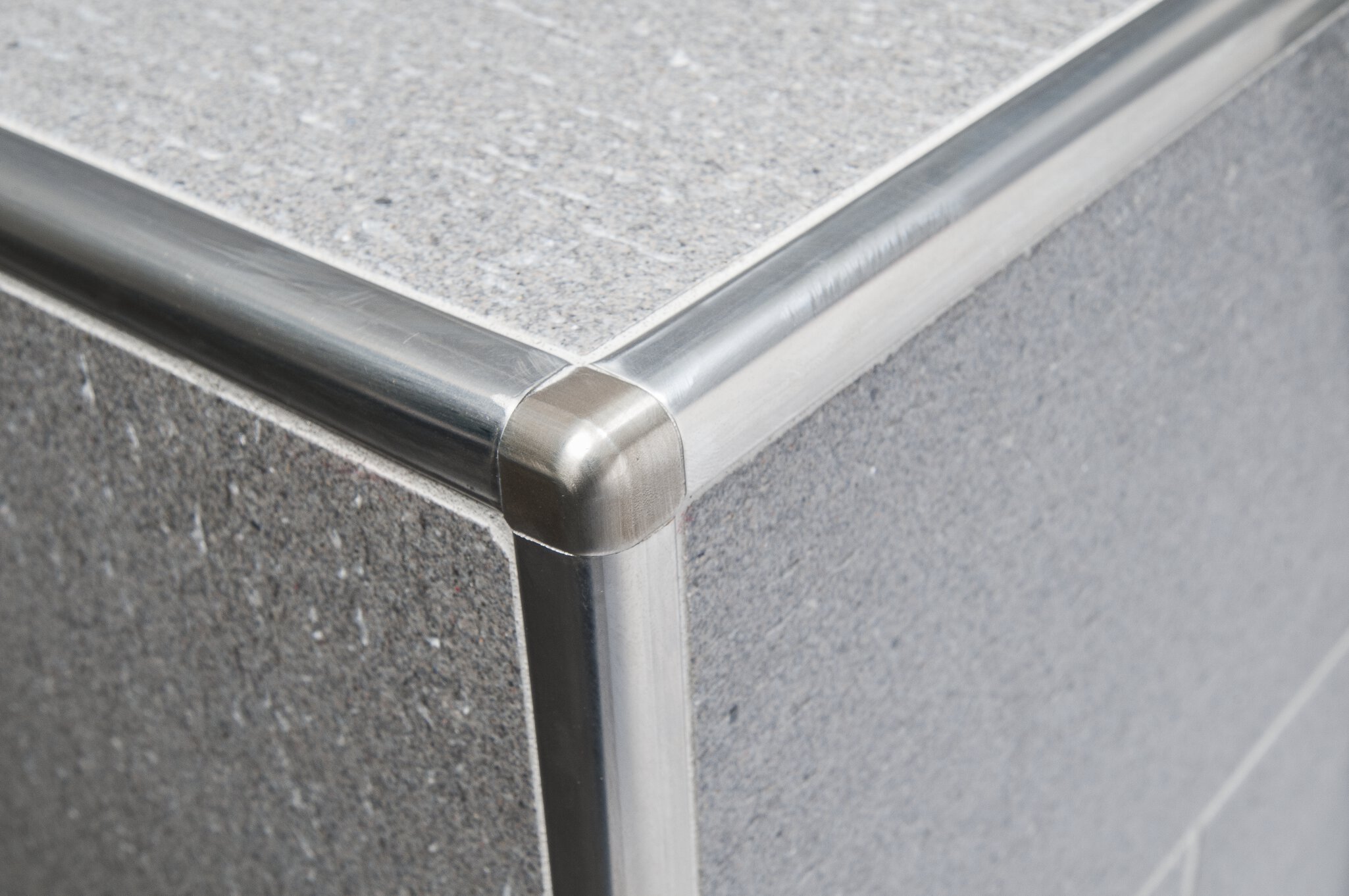 El perfil de borde de amplio radio RONDEC y los accesorios de esquina angular se utilizaron para rematar los bordes de las baldosas del muro de partición.