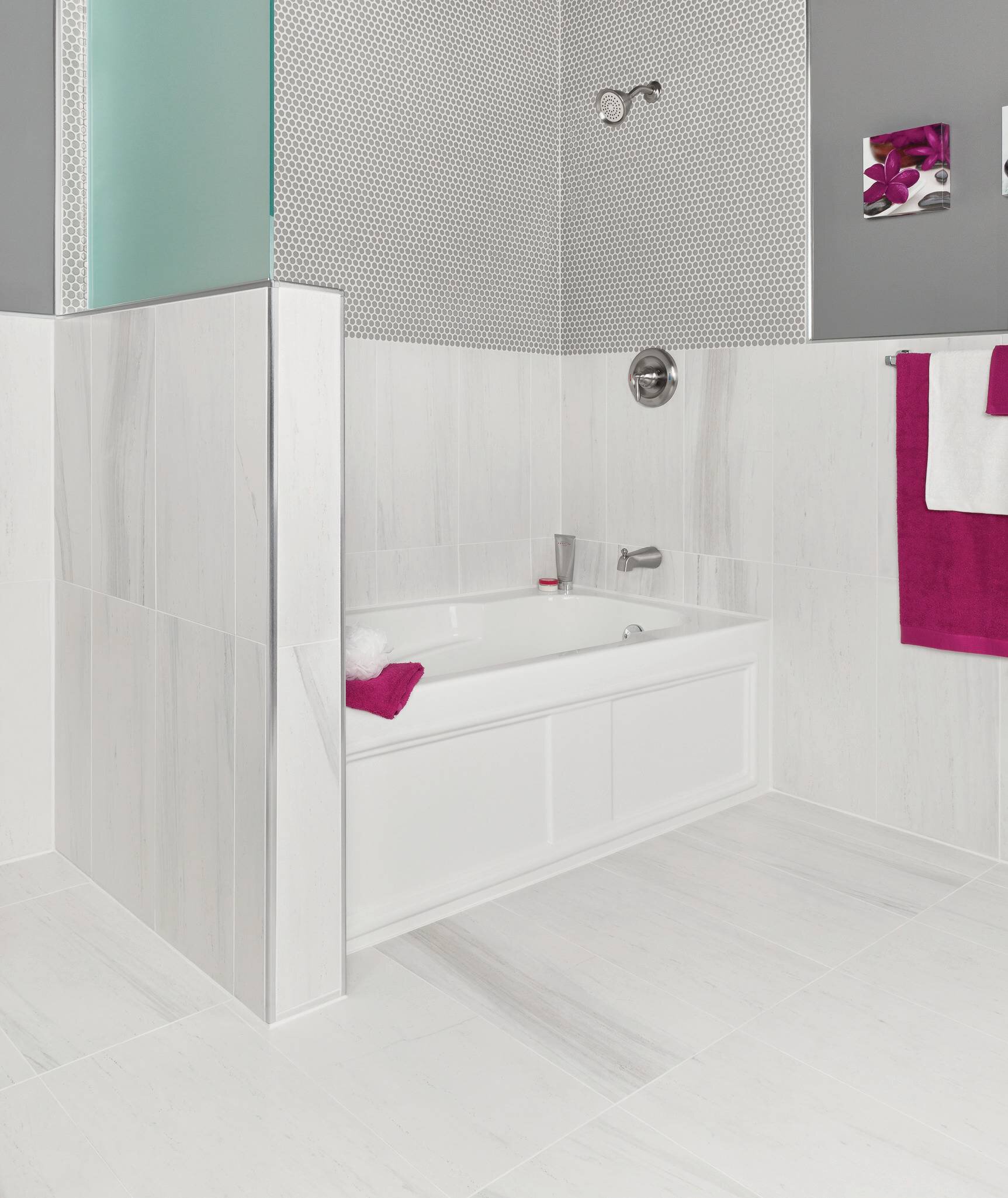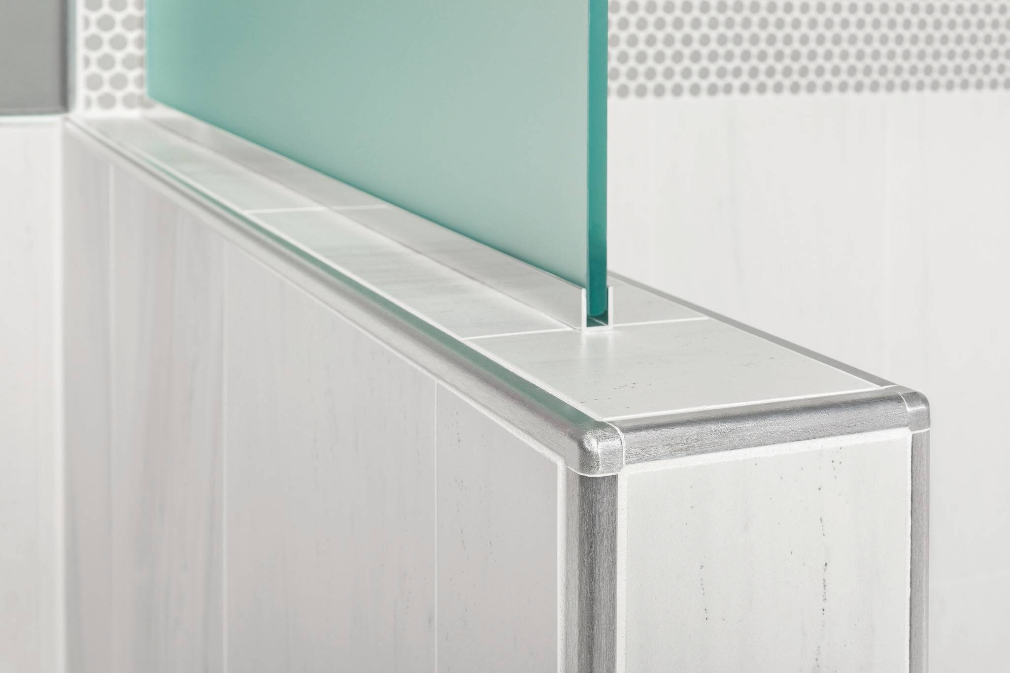 El perfil de amplio radio y esquinas RONDEC se utilizaron para terminar los bordes de las baldosas del muro de partición.