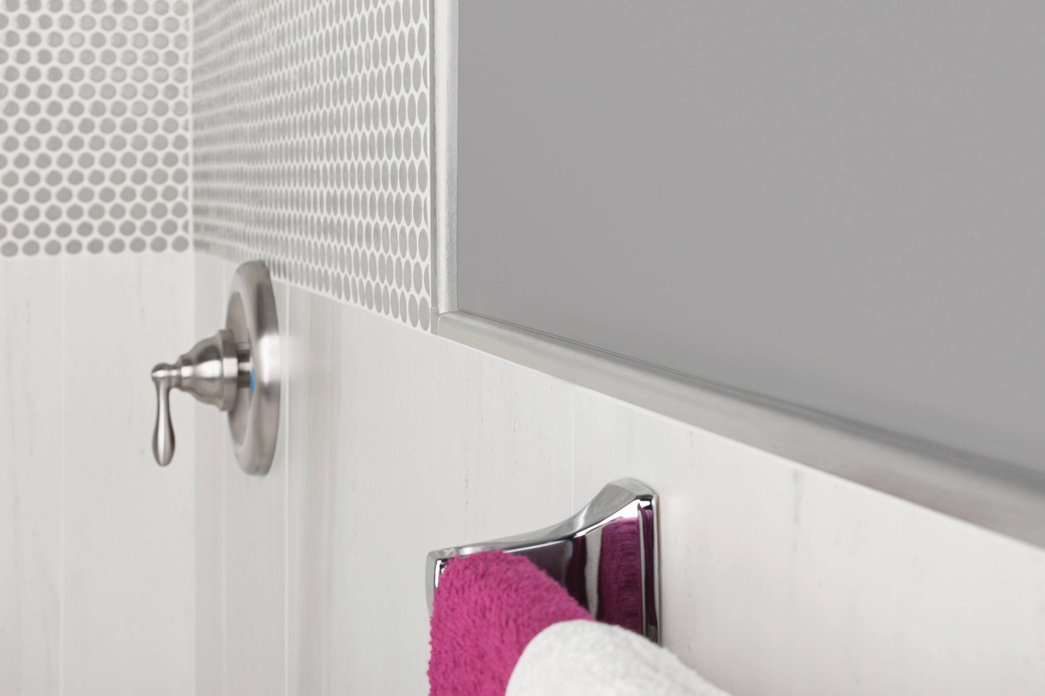 El perfil de amplio radio y esquinas RONDEC se utilizaron para terminar los bordes de las baldosas de las paredes.