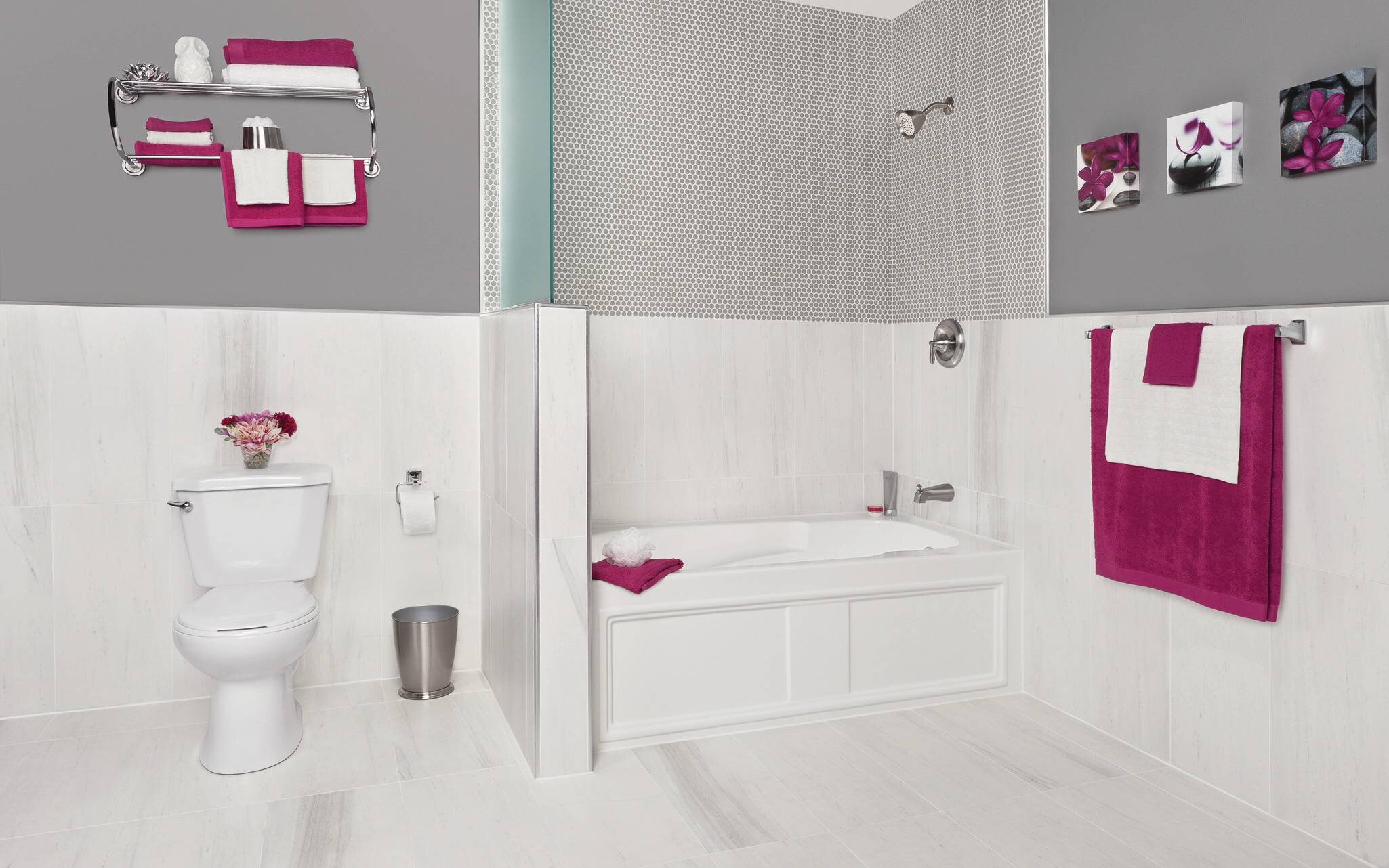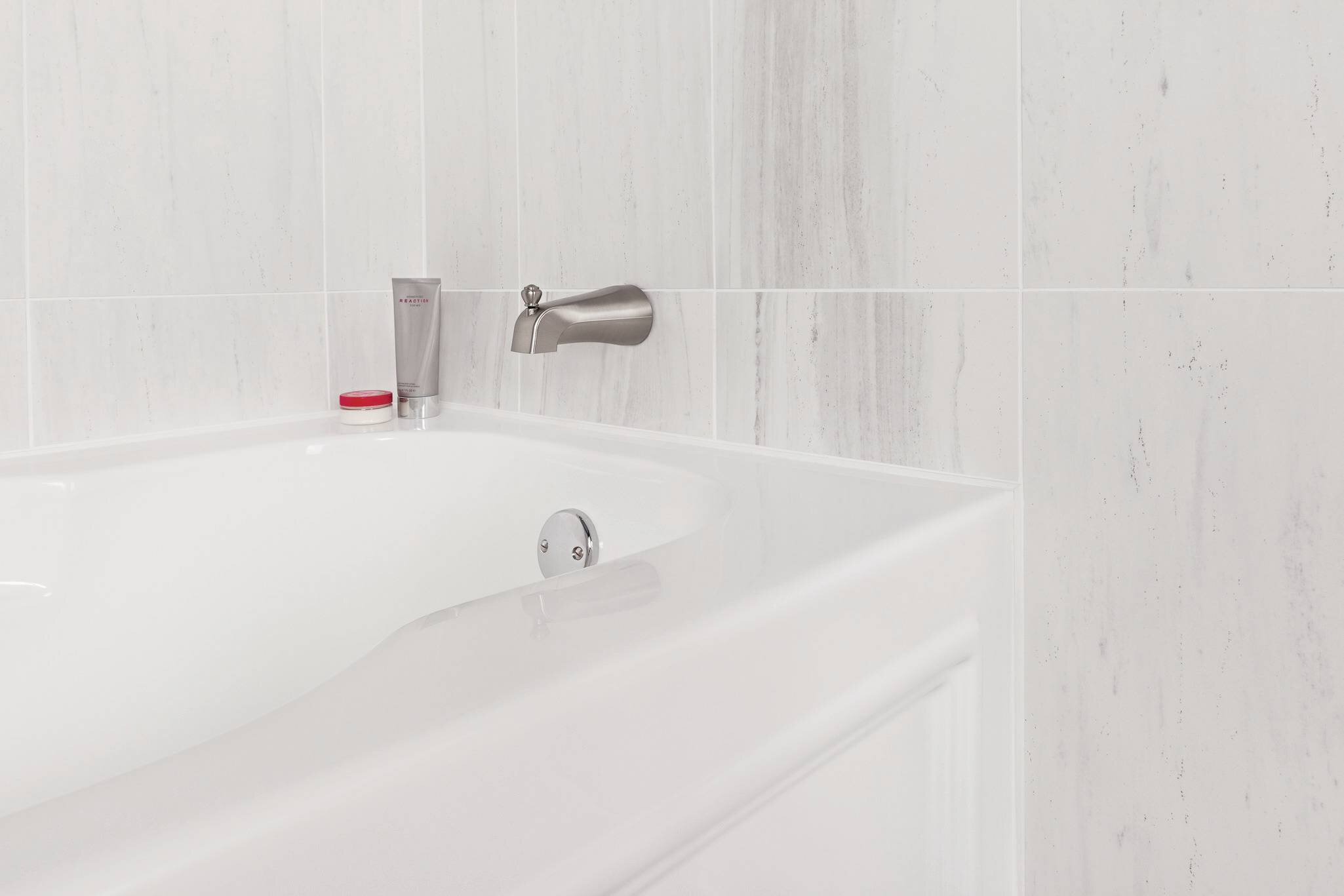 El perfil de amplio radio y esquinas RONDEC se utilizaron para terminar los bordes de las baldosas de las paredes. El perfil de movimiento de esquina DILEX-BWA en PVC en blanco brillante se utilizó para crear una transición sin uniones entre la bañera y las paredes.