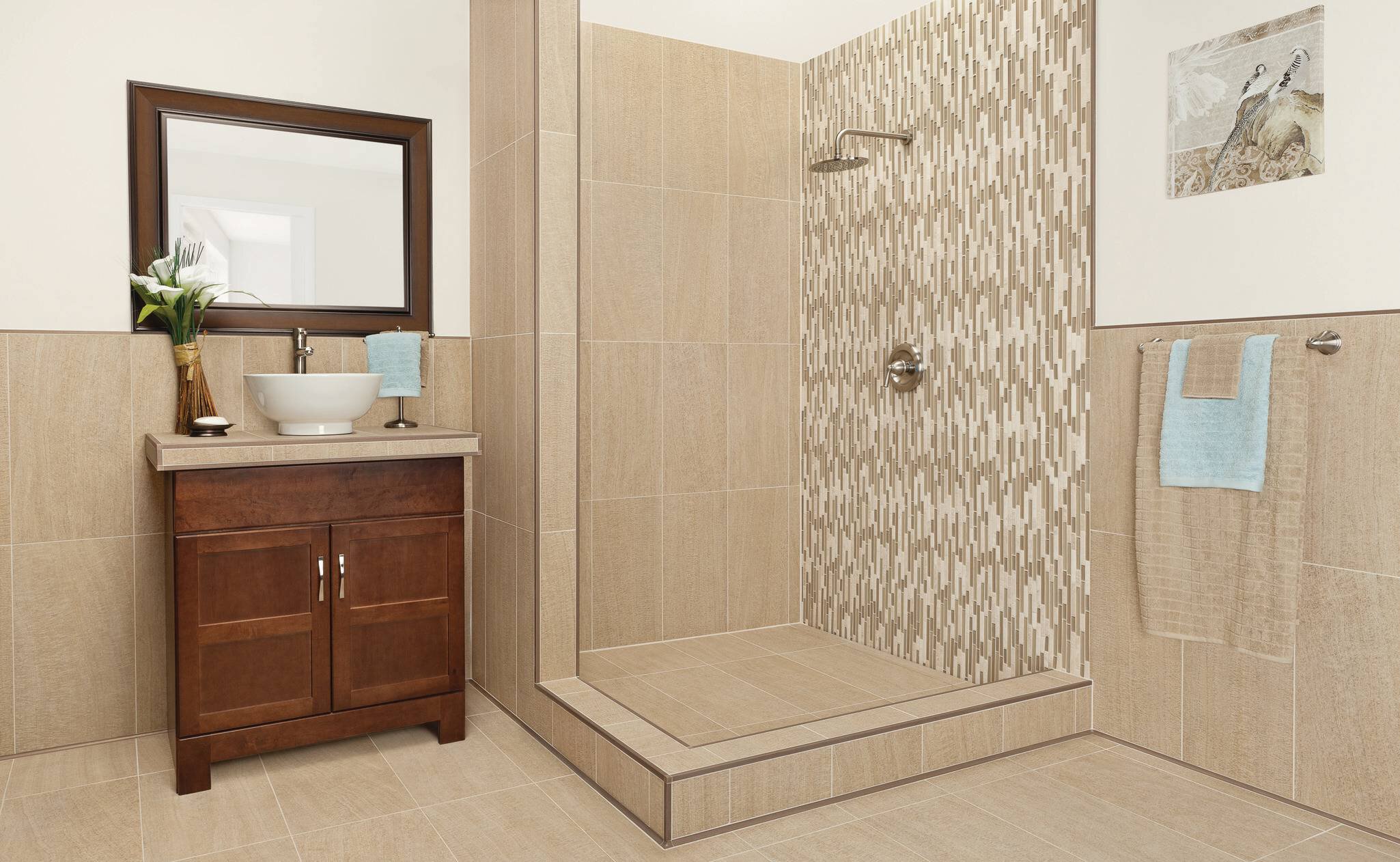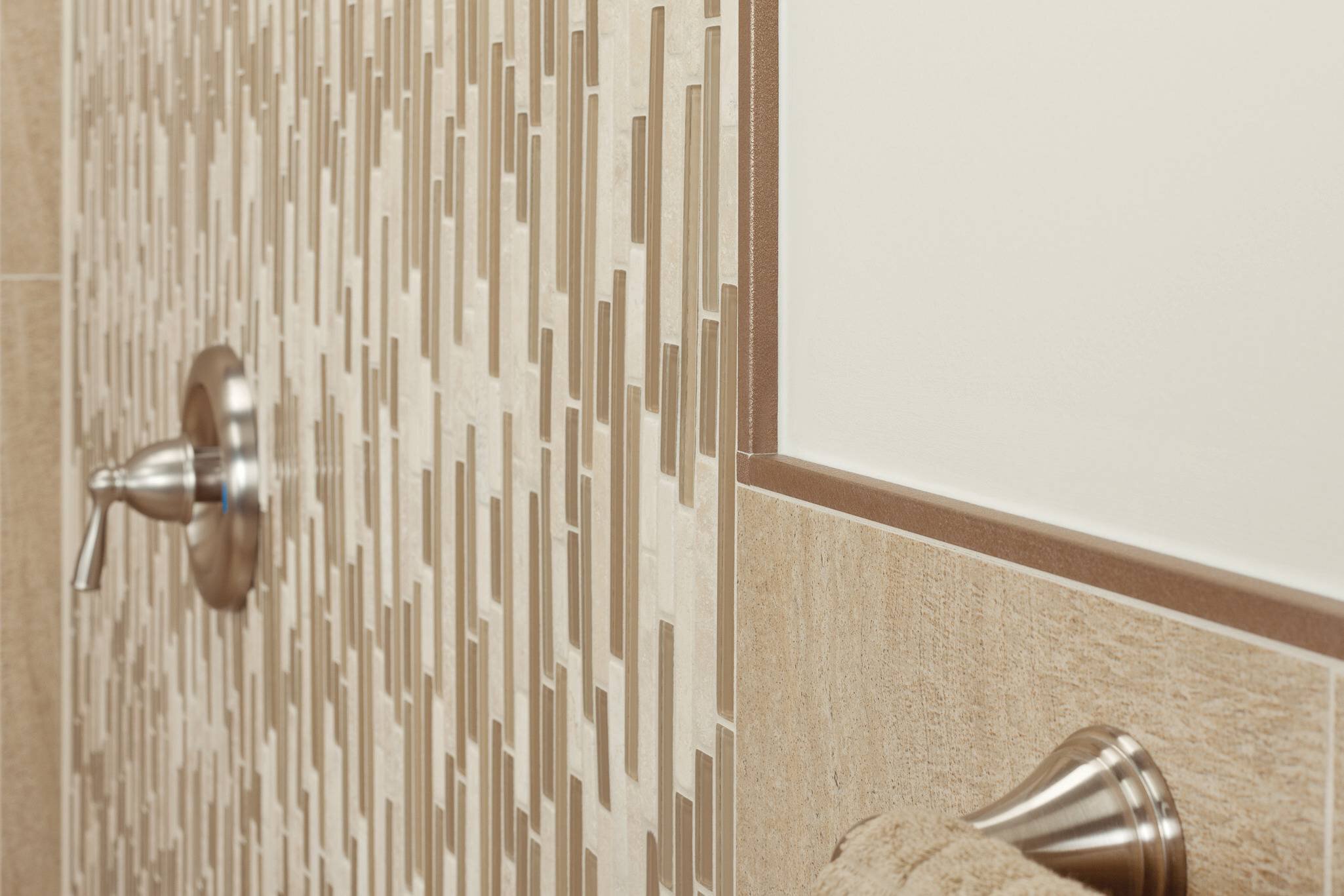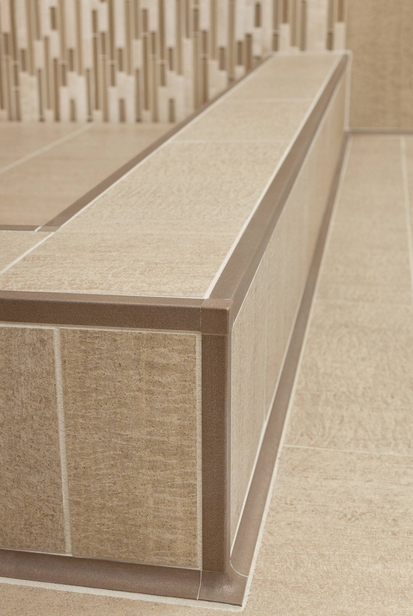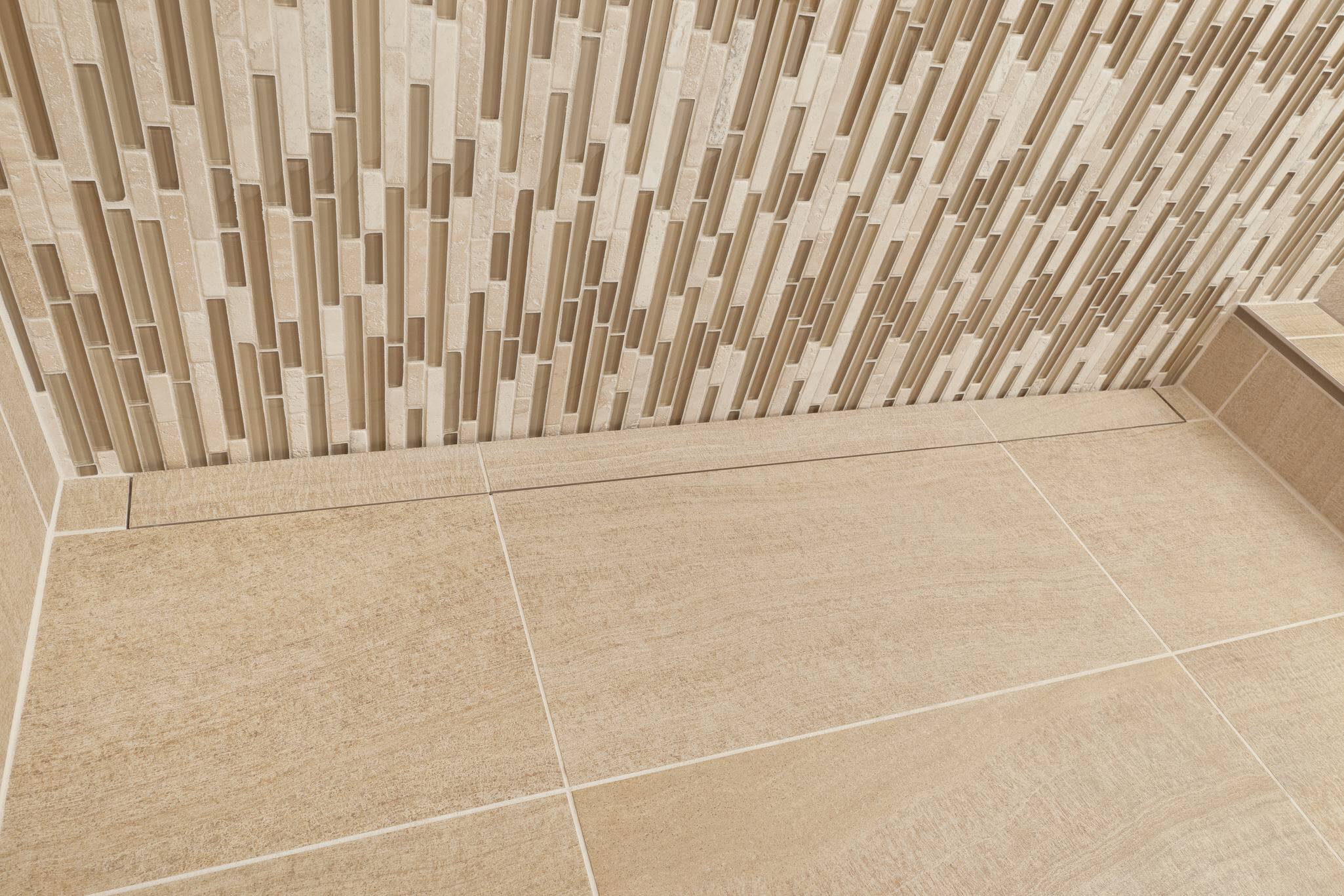 QUADEC perfil cuadrado y esquinas aplicados para revestir los bordes de las paredes, el borde de la ducha y la encimera. DILEX-AHK perfil en forma de mediacaña y esquinas utilizados para crear una transición suave entre las paredes y el piso. DILEX-EKE Perfil de PVC para juntas de movimiento en esquinas insertado en las esquinas de la ducha y a lo largo del piso de la ducha. El drenaje lineal KERDI-LINE en esta ducha cuenta con la rejilla TILE sin marco, lo que permite que el drenaje sea prácticamente invisible. La construcción de una ducha y de un muro de partición con KERDI-BOARD elimina pasos al proporcionar un soporte estable e impermeable.