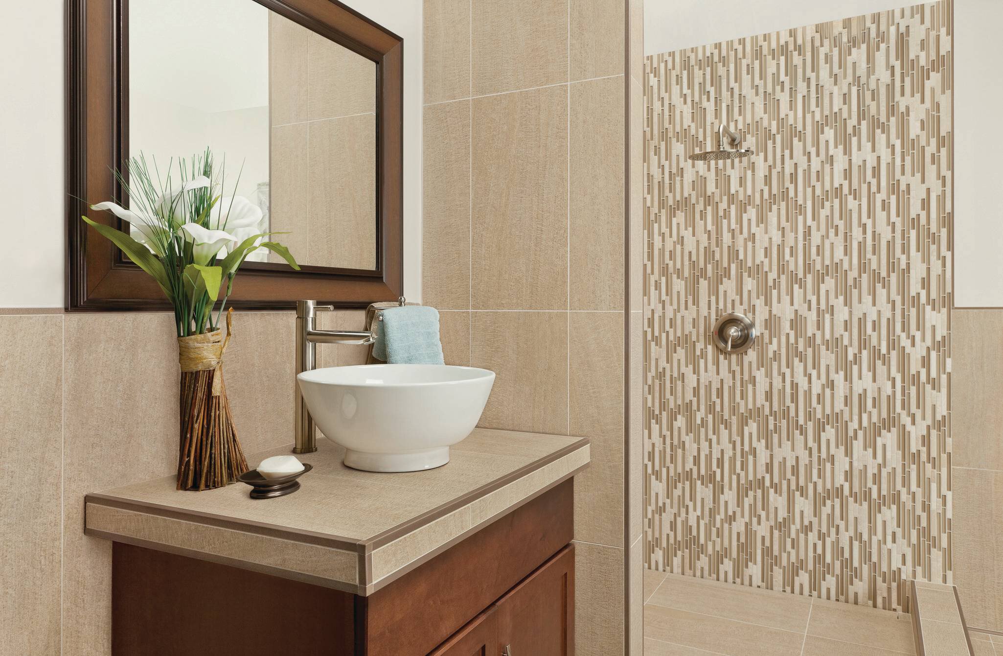 Perfil cuadrado QUADEC y esquinas aplicados a los bordes de las baldosas de la encimera. La encimera cue construida con KERDI-BOARD y acabada con la misma baldosa que se utilizó en el resto del baño, creando un estilo uniforme.