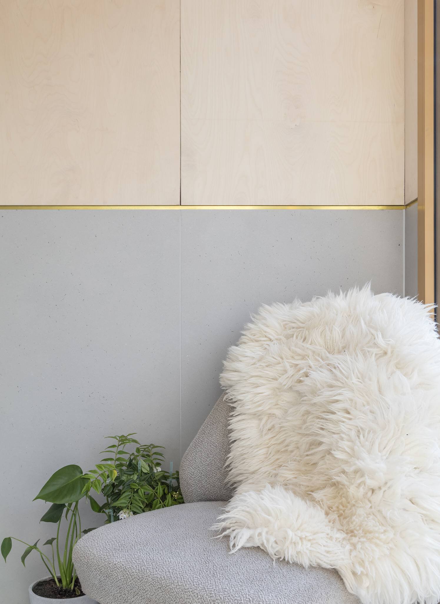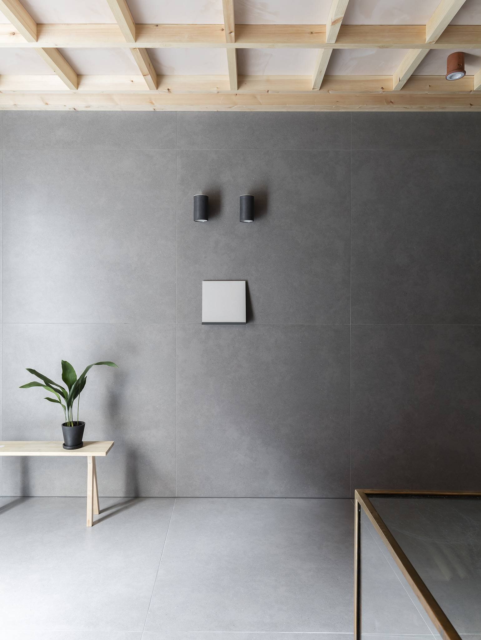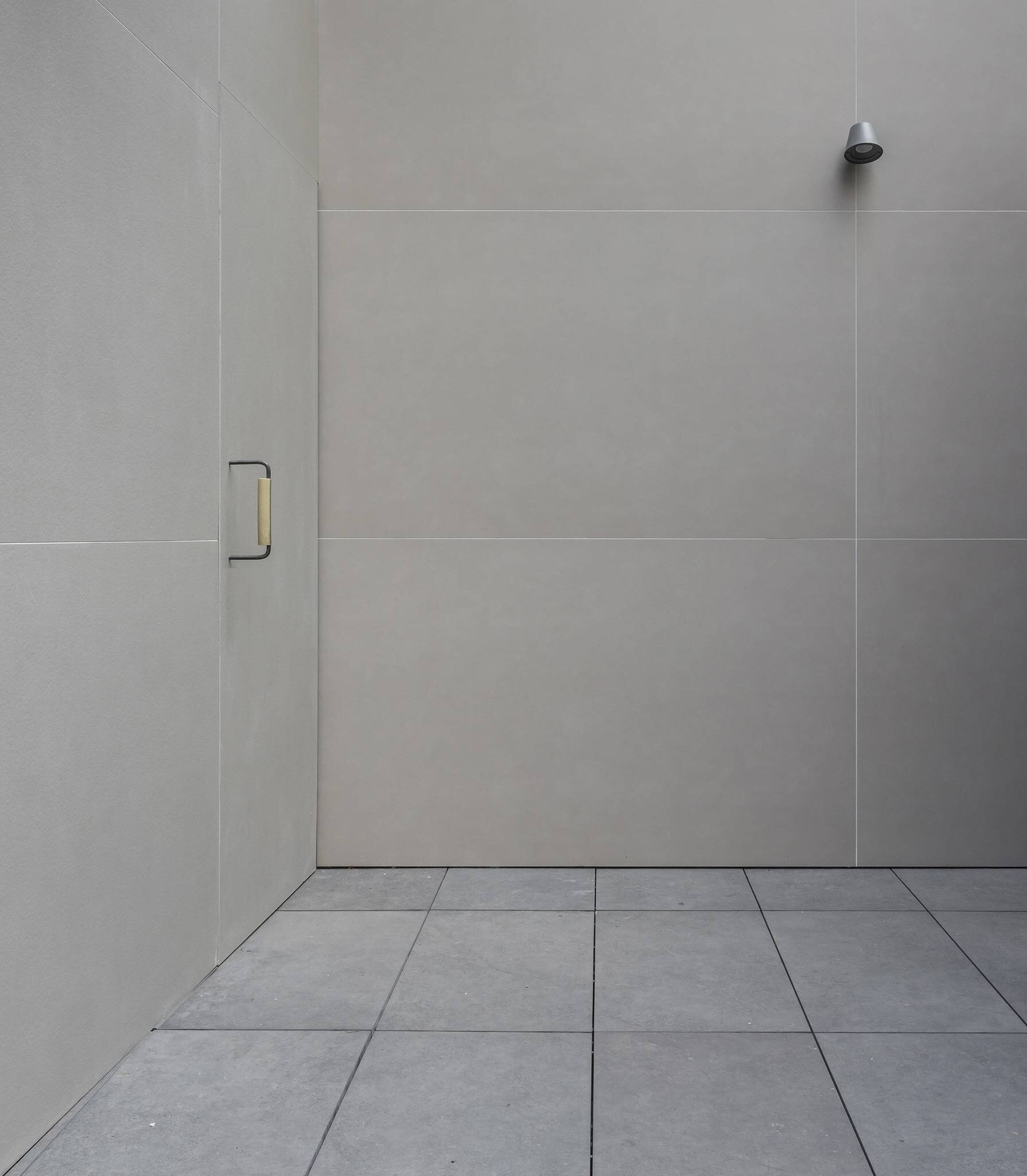 Elegantes perfiles decoran y rematan el revestimiento de la pared, dividiendo perfectamente los tonos apagados de la baldosa de gran formato.
