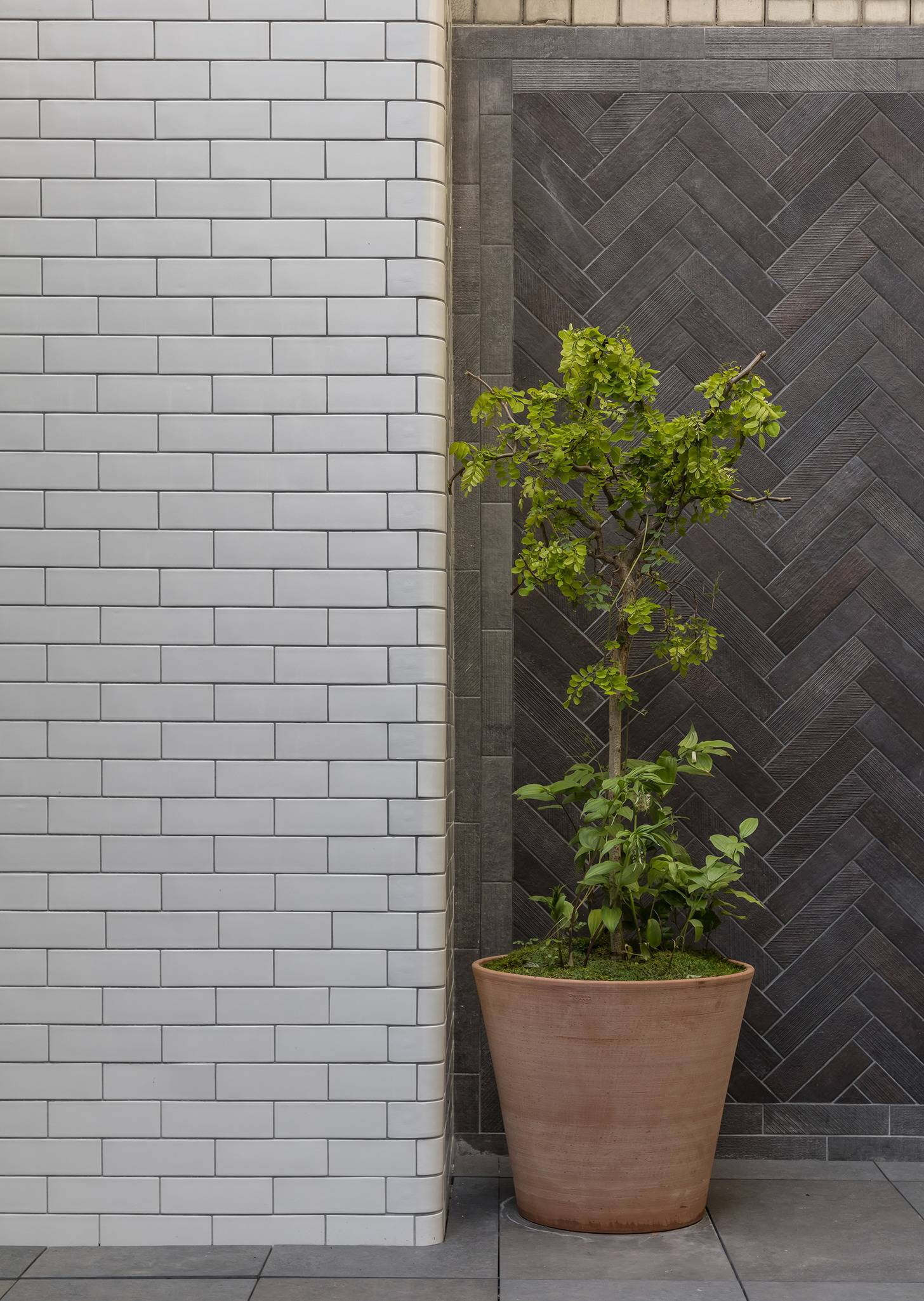 Una mezcla de colores, texturas y formas de baldosas crea un lienzo complementario para el follaje natural del patio exterior.