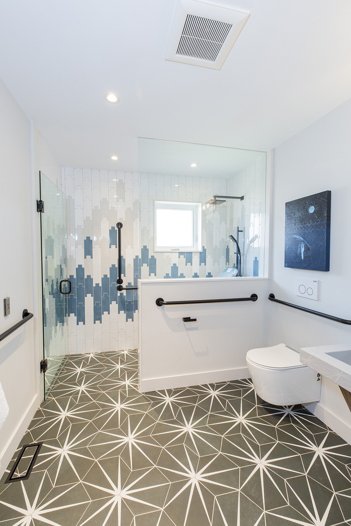 Un plato de ducha Schluter crea una entrada nivelada con el resto de la habitación creando una ducha accesible para sillas de ruedas.