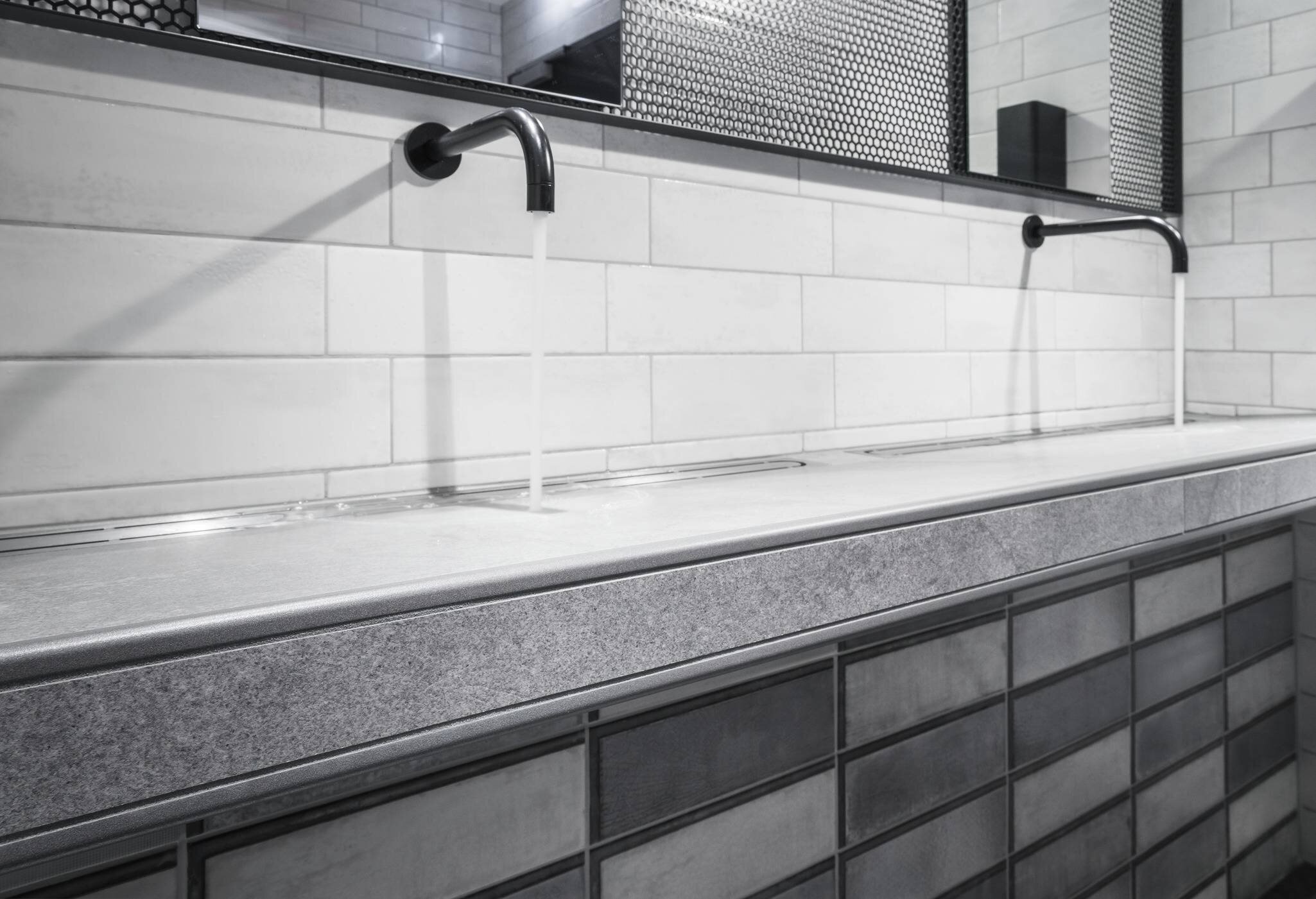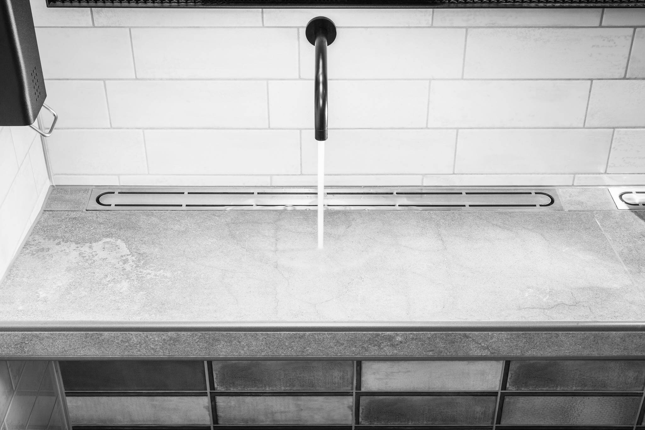 El drenaje del agua nunca ha lucido tan bien. Este lavabo a medida se creó utilizando la funcionalidad de KERDI-BOARD y el estilo de KERDI-LINE-STYLE en Pure. El perfil RONDEC remata el lavabo con esquinas suaves, haciendo un guiño a los tonos grisáceos de la baldosa de aspecto pétreo.