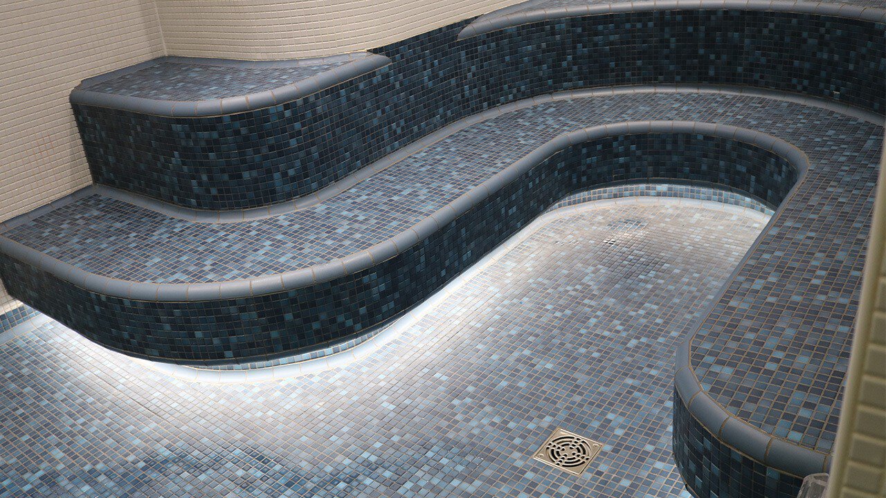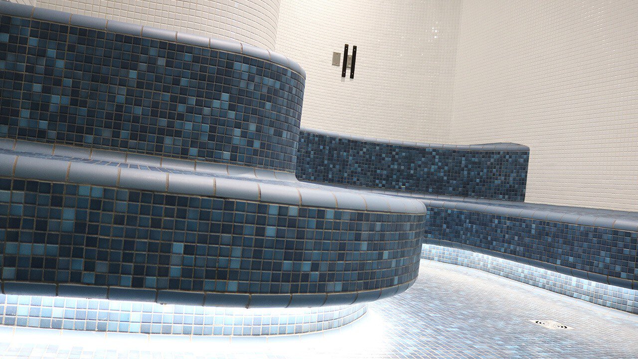 Curvas en capas, detalles de mosaico y una suave iluminación bajo el banco se combinan en este diseño de baño de vapor, que incluye un KERDI-DRAIN para un drenaje eficiente y discreto.