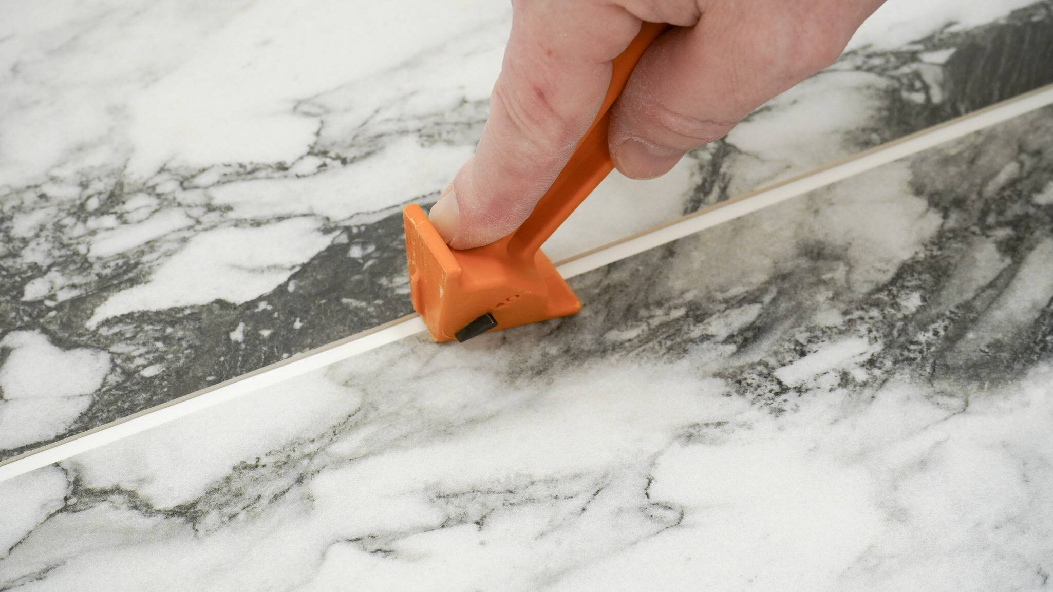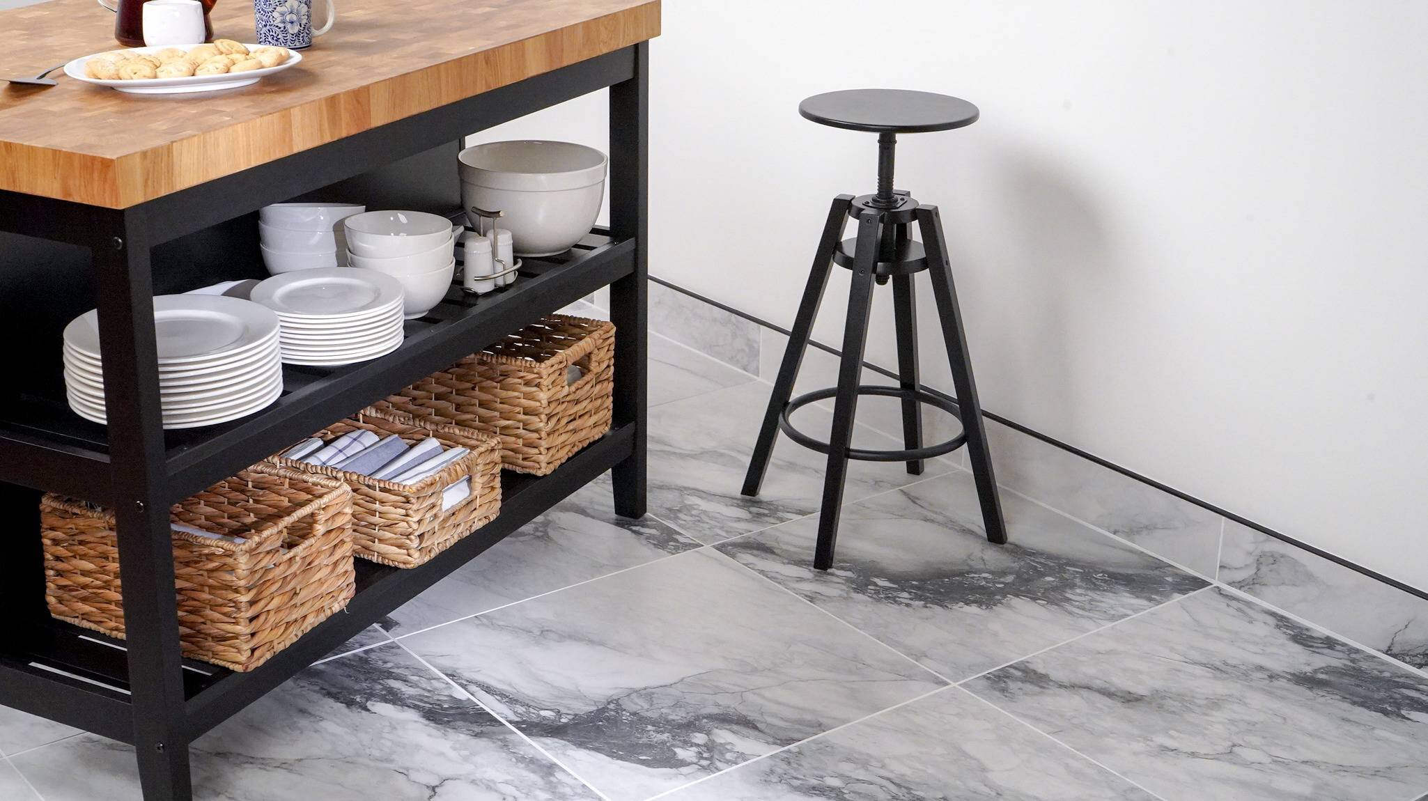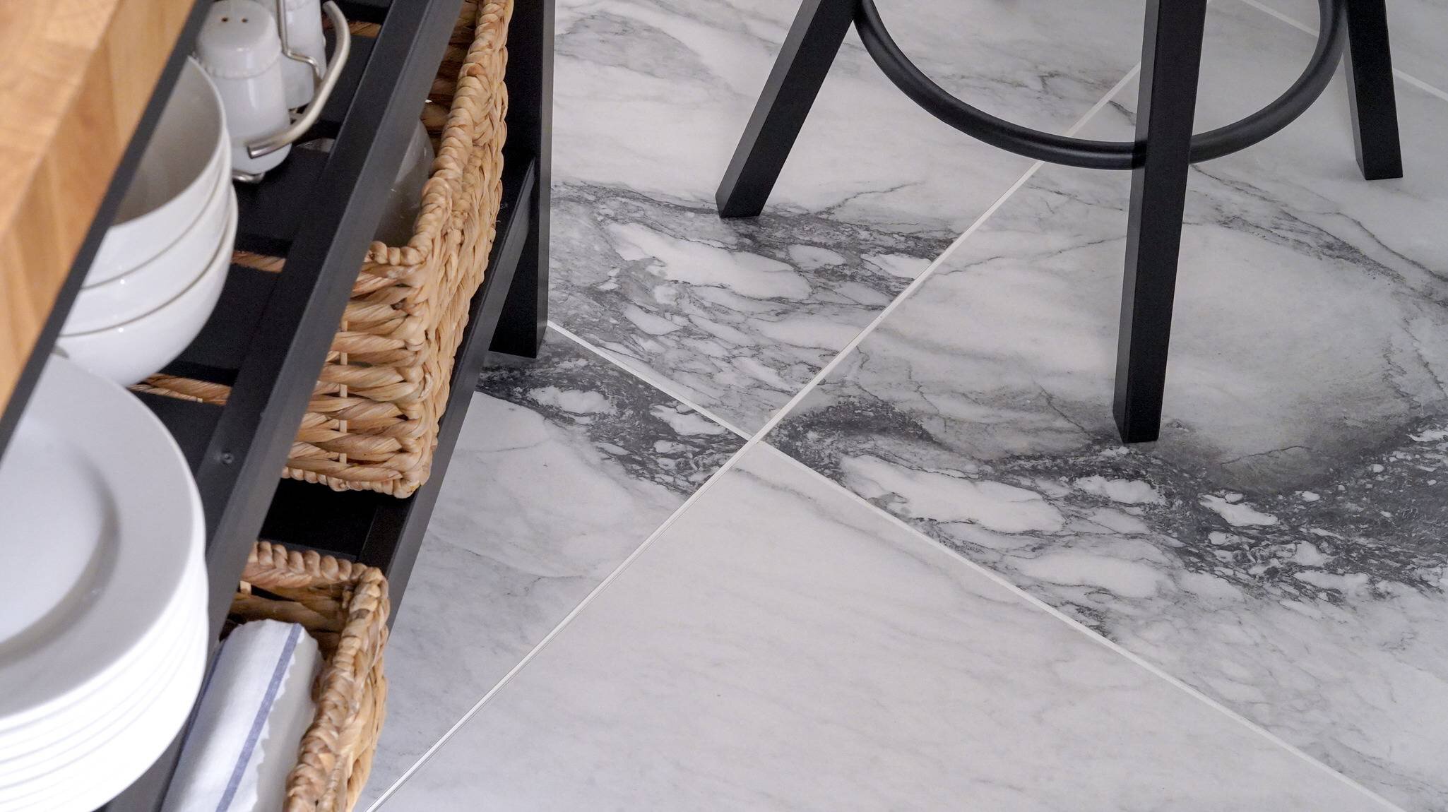 Schluter®-DILEX-F ayuda a proteger este hermoso piso de cocina del movimiento del substrato y combina con la lechada brindando un aspecto uniforme.
