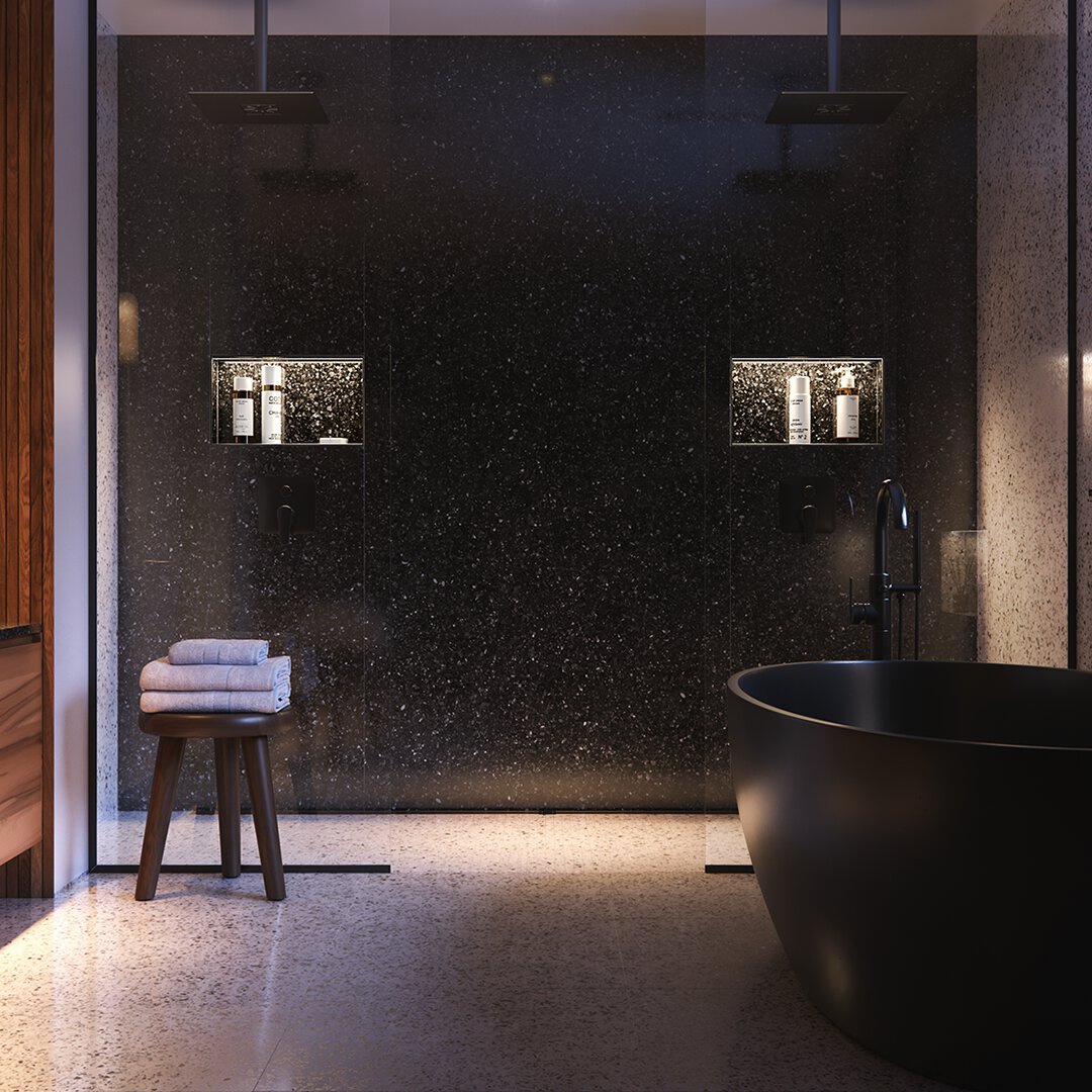 Take a peek at this warm, neutral bathroom featuring matte black trim and redesigned Jolly profiles.
